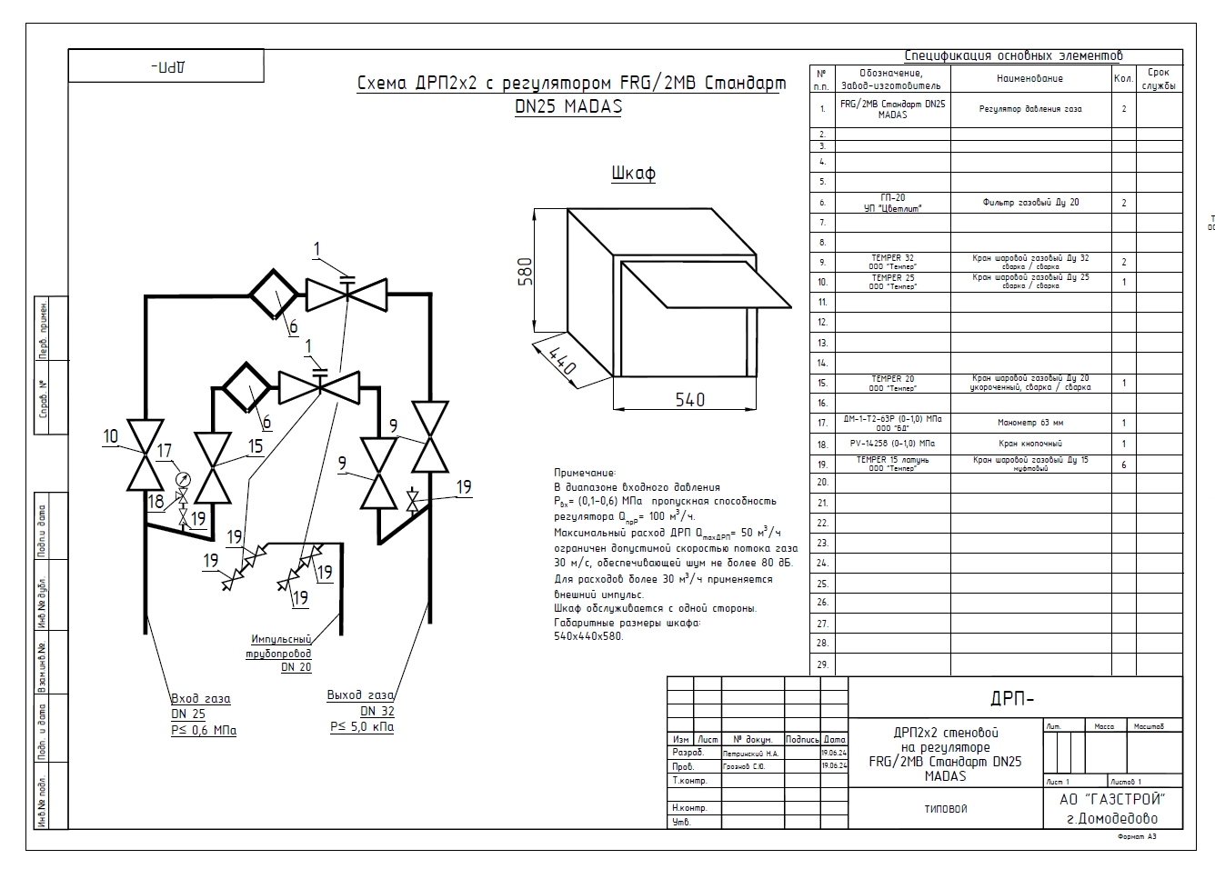 Вся продукция, выпускаемая АО ГАЗСТРОЙ имеет сертификацию ГАЗСЕРТРассчитать стоимость домового регуляторного пункта , нужен подземный вариант Здравствуйте, просчитайте, пожалуйста, стоимость. ДРП с регулятором RF-25 или FE-25, фильтр газовый, газовый счётчик G-4 c или Омега GSM, сигнализатор загазованности Хотели у Вас запросить коммерческое предложение на Регулятор давления РД-25 Подготовить расчет модульного пункта МРПБ
